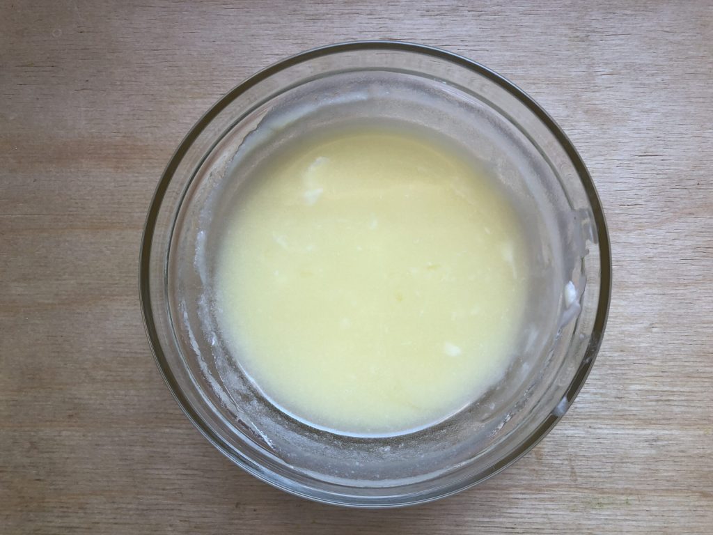 Smelt eerst de boter au bain-marie of in de magnetron en laat het afkoelen terwijl je doorgaat met de rest van de bereiding.