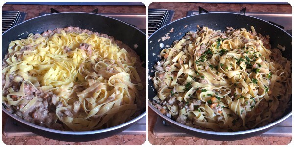 Kook ondertussen de tagliatelle in ruim gezouten kokend water; giet ze al dente af, maar laat ze niet te droog uitlekken en doe ze direct in de sauspan. Laat ze, al roerend, kort op het vuur sudderen en voeg dan verse peterselie toe voor smaak.