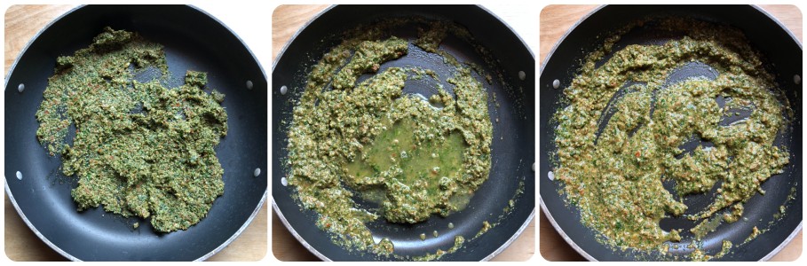 Voeg vervolgens de olijfolie toe en meng het door het mengsel. De hoeveelheid olie hangt af van hoe zacht je je saus wilt. Ik heb er weinig (slechts 20 ml) toegevoegd omdat ik, zoals je zult zien, de saus in de pan heb verzacht met wat pasta-kookwater. Op deze manier heb ik aanzienlijk de vetten (en calorieën) verminderd.