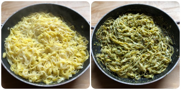 Bereiding van de tagliatelle met vreemde pesto