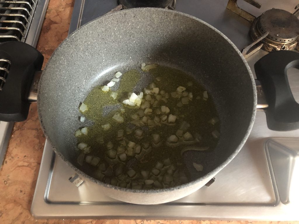 Pel de ui, hak hem fijn en bak hem in twee eetlepels olie in een kookpan.