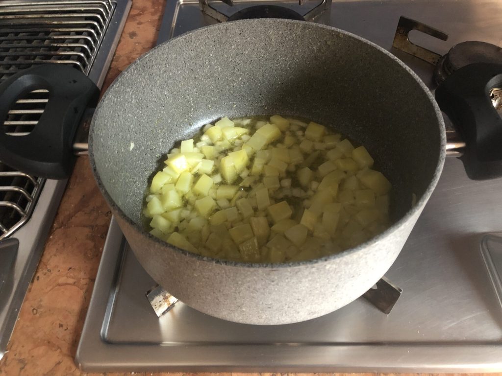 Laat even sissen, voeg dan de aardappelblokjes toe met een beetje water en roerbak ongeveer drie minuten op middelhoog vuur en roer regelmatig.
