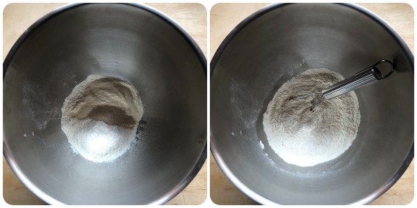 Doe de twee soorten bloem in de kom van de keukenmachine samen met de gedroogde gist en meng goed met een kleine handgarde.