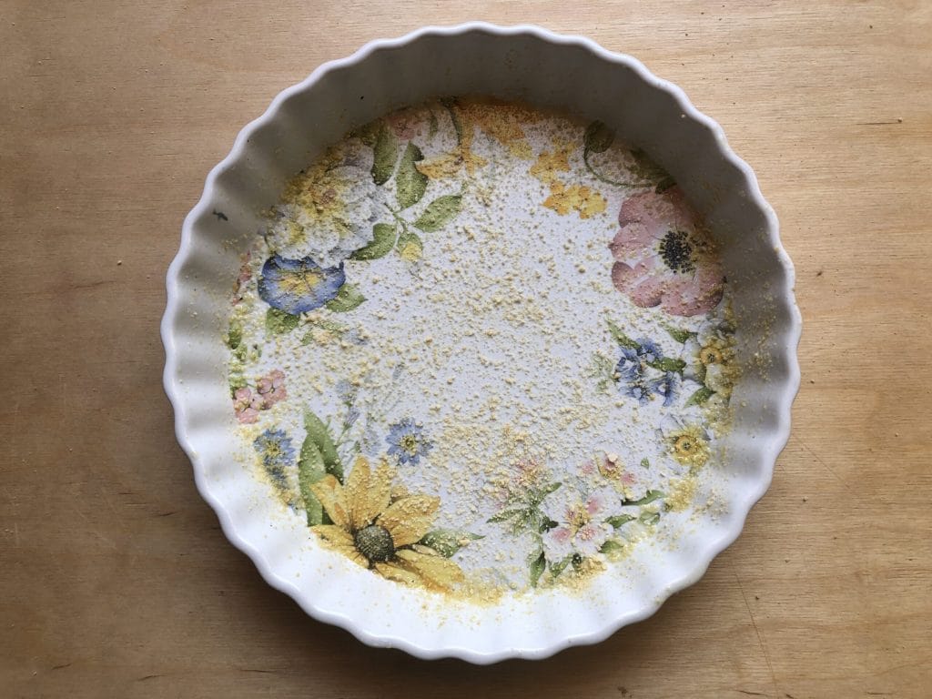 Vet een quichevorm (of ovenschaal) met een diameter van 22 cm in met een beetje olie en bestrooi deze met een dun laagje paneermeel.