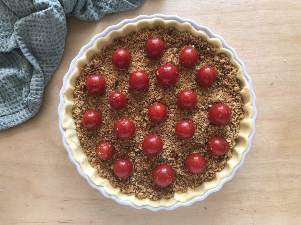 Als de aromatische crumble is afgekoeld, giet deze dan in de quichevorm bovenop de kaasplakjes en verdeel gelijkmatig.