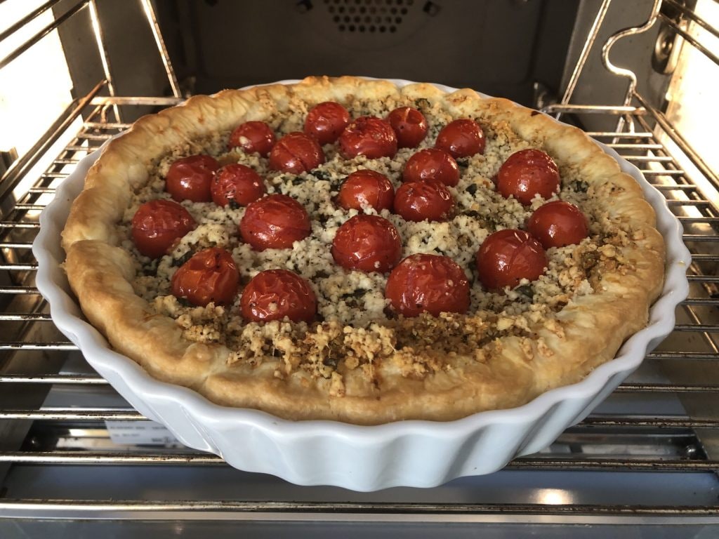 Bak de tomatenquiche in een voorverwarmde statische oven op 200°C gedurende 30 minuten, en dek af met een vel aluminiumfolie in de laatste paar minuten van het bakken als hij te bruin wordt.