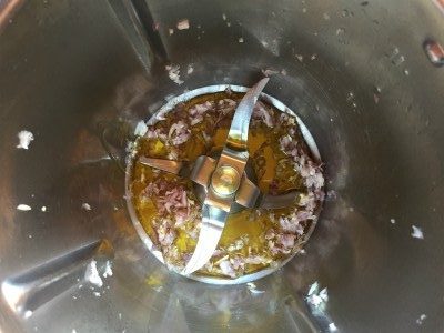 Pel het teentje knoflook en de sjalot, doe ze in de mengbeker en hak ze 4 seconden op snelheid 7. De sjalot kan worden vervangen door een halve gele ui. Als je niet van knoflook houdt, kun je het weglaten.