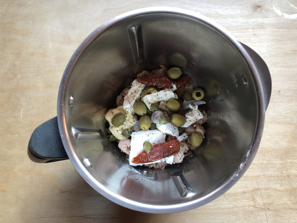 • Blend alles tot een zachte en homogene crème. Het maakt niet uit als er nog wat stukjes olijf of kappertje achterblijven. Ik heb gemixt met de Bimby en deed het op gevoel, mixend meerdere keren 10 seconden op snelheid 5 en haalde telkens het mengsel naar het midden van de beker.