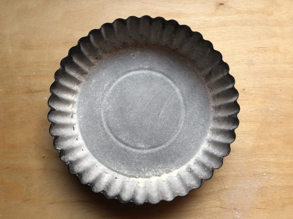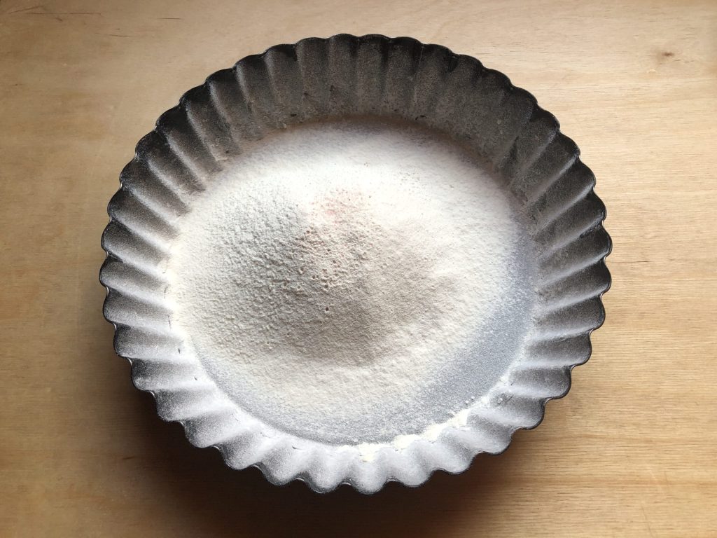 Eerst vet je een bakvorm in en bestuif je die met bloem; gebruik een bakvorm met een diameter van 24 cm.