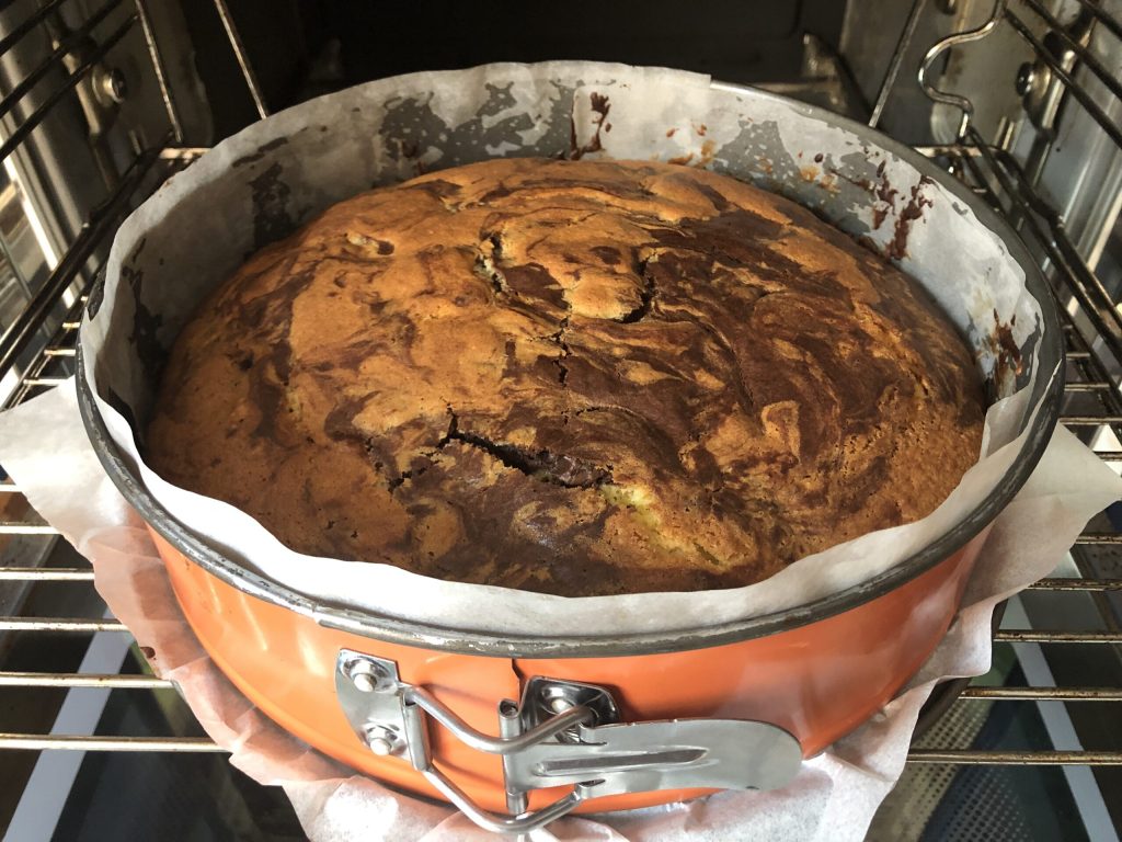En hier is hij net uit de oven!Laat de twee-kleuren taart volledig afkoelen voordat je hem uit de vorm haalt.