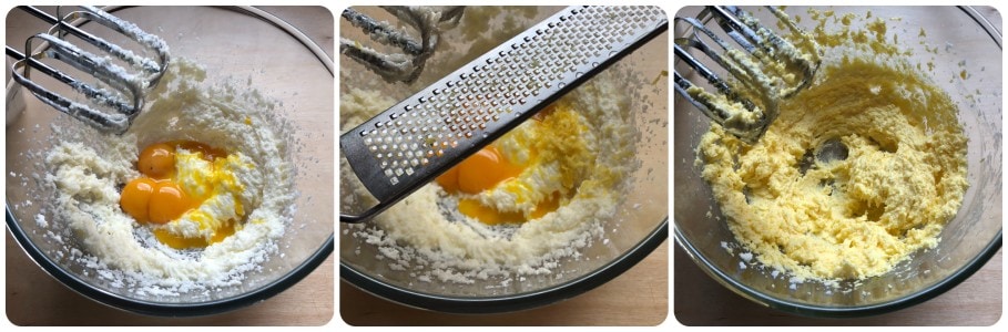 Voeg vervolgens de dooiers en de citroenschil toe en meng opnieuw met de mixer.