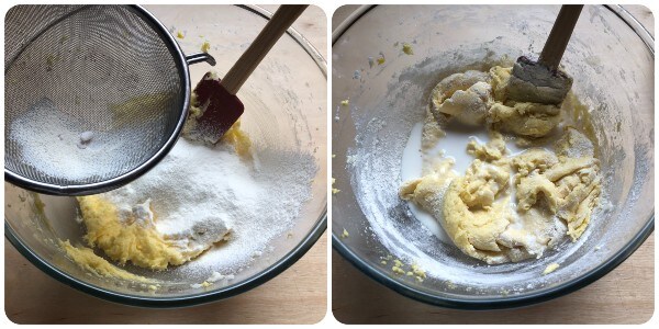 Begin nu de bloem geleidelijk te zeven en toe te voegen, samen met het bakpoeder, en wissel het af met de botermelk.