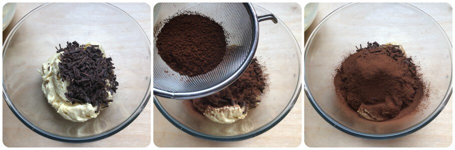 Voeg aan de ene helft de chocoladeschilfers en de gezeefde cacao toe.