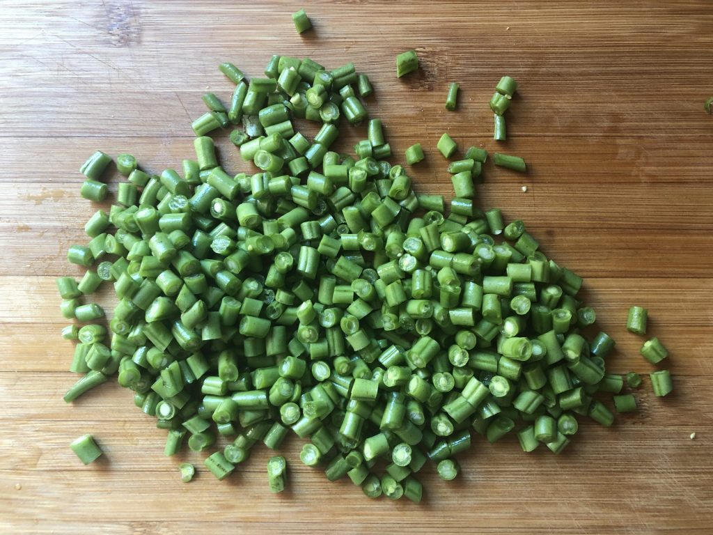 Snijd de uiteinden van de sperziebonen, was ze en snijd ze in stukjes.