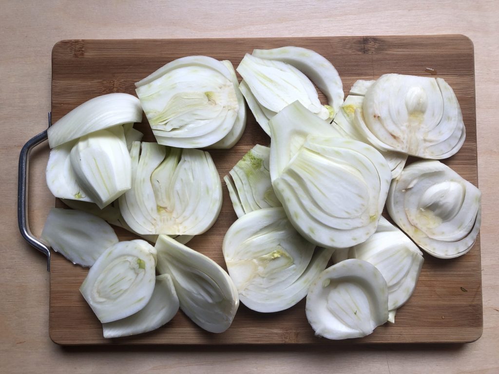 Maak de venkel schoon door de stengels en een deel van de basis te verwijderen. Was ze goed onder stromend water en snijd ze in plakjes van ongeveer een halve centimeter dik.