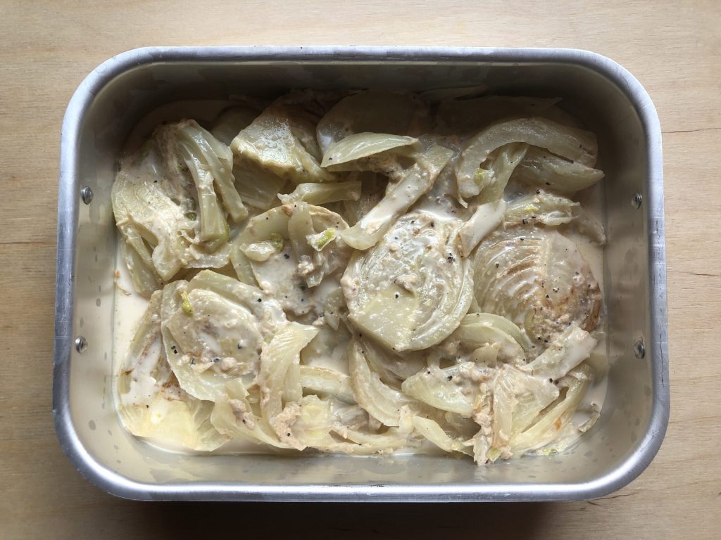 Smelt de boter in een ruime pan voordat je de venkel toevoegt. Zout en peper naar smaak. Als je ze net als ik in twee lagen moet leggen, zout en peper dan beide.