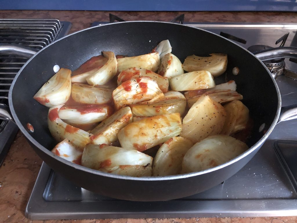 Verwarm in een ruime braadslede enkele eetlepels olie, voeg dan de venkelparten toe (nog nat), een paar royale snufjes zout en een overvloedige hoeveelheid gemalen zwarte peper.