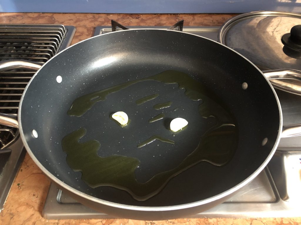Verhit enkele eetlepels olie in een grote pan en bak hierin een gepelde knoflookteen, doormidden gesneden en verwijderd van de centrale kern.