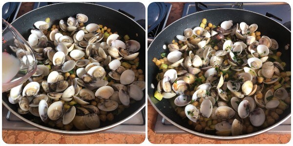 • Doe het deksel erop en kook ze op hoog vuur gedurende 3/4 minuten of totdat ze opengaan; besprenkel ze vervolgens met een scheutje witte wijn en laat het verdampen.