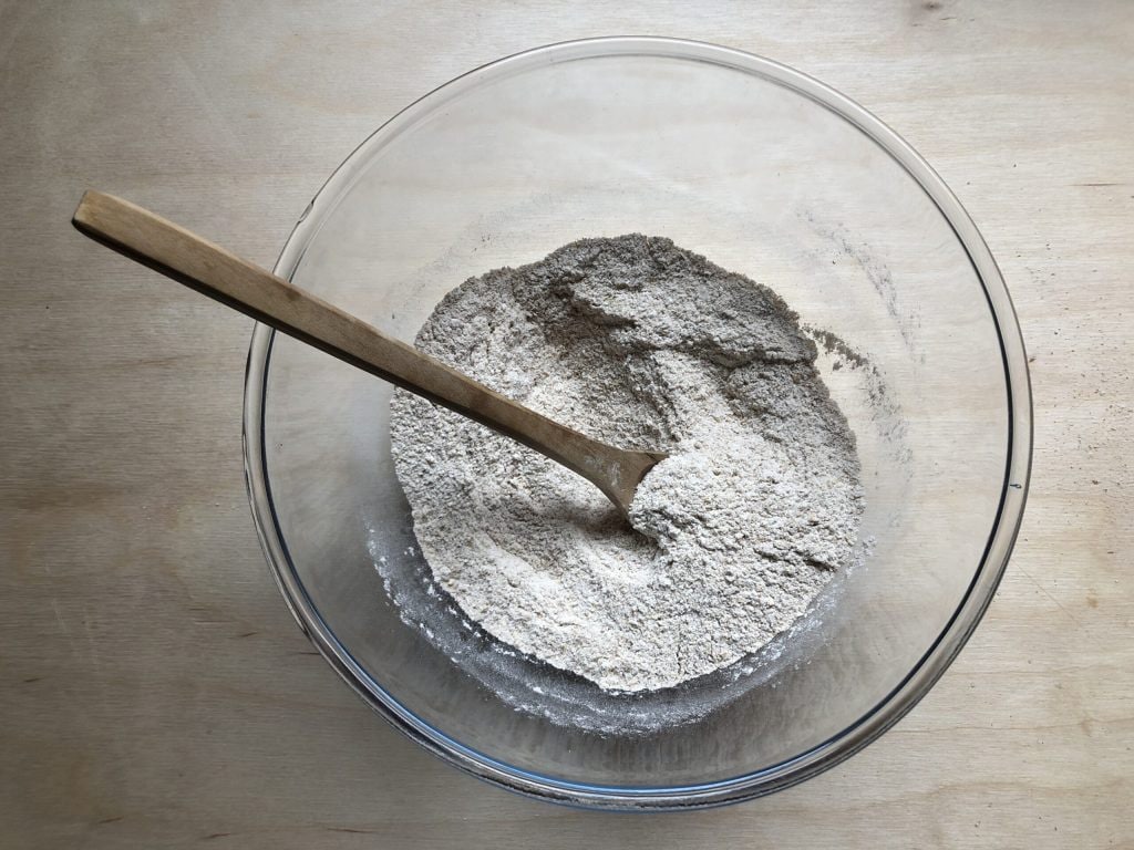 • Meng in een middelgrote kom het volkorenmeel met de havermoutzemelen, het bakpoeder en een snufje zout.