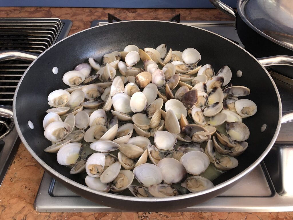 Zuiver de vongole volgens de procedure beschreven HIER. Als u diepgevroren en al gezuiverde vongole gebruikt, is deze stap uiteraard overbodig. In dat geval raad ik aan om ze een paar uur voor gebruik van de vriezer naar de koelkast te verplaatsen.