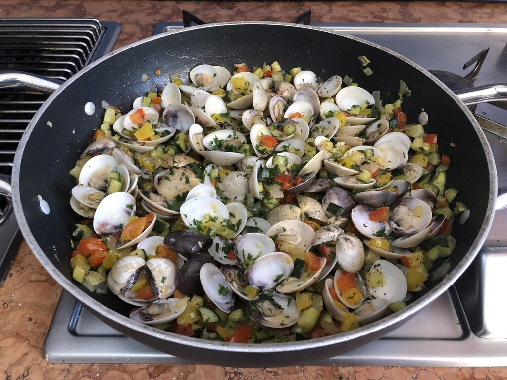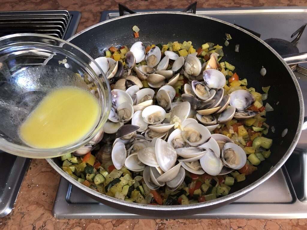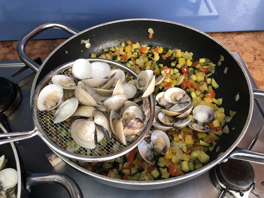 Verplaats op dit punt met een schuimspaan de vongole naar de pan met groenten.