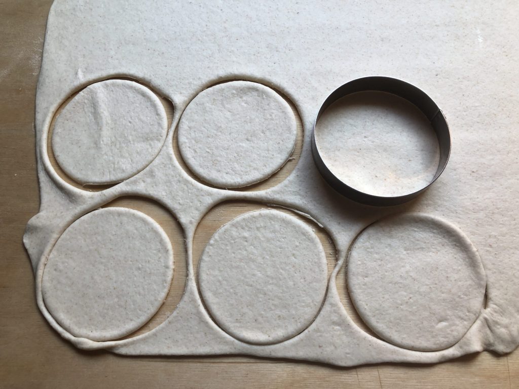 • Na de rijstijd, leg het deeg op een licht met bloem bestoven werkblad, rol het met de deegroller uit tot een dikte van 4/5 mm en snijd er rondjes uit met de deegsnijder.