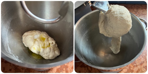 Wanneer het mengsel samenhangt en de bloem de vloeistoffen heeft opgenomen, voeg ook de olie en het zout toe. Blijf kneden tot een glad en homogeen deeg dat zich om de haak wikkelt.