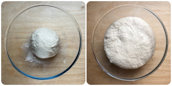 Haal het deeg op het werkblad, kneed het kort met de handen, vorm een bal en leg het in een licht met bloem bestoven kom. Dek af en laat rijzen tot het volume verdubbeld is op een warme plaats zonder tocht. De rijstijd hangt sterk af van de omgevingstemperatuur en kan variëren van twee tot drie uur.