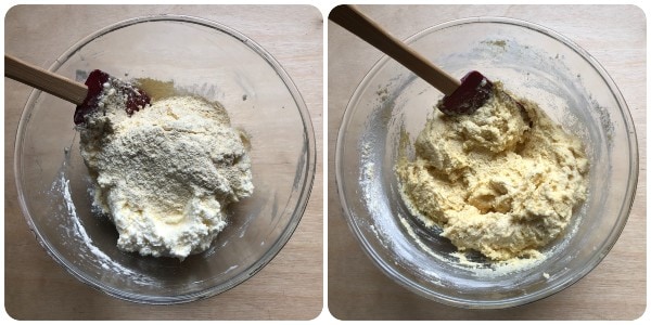 • Doe in een tweede kom de twee soorten bloem, een snufje zout, het bakpoeder (het puntje van een theelepel), de citroenschil gehaald met een citrusrasp en meng goed met een kleine handklopper.