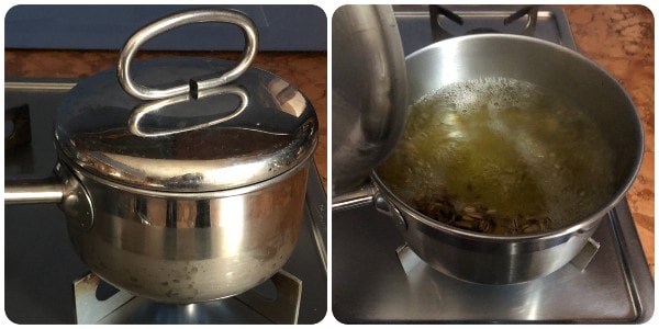 Doe in een steelpan het water (koud) samen met de gember, venkelzaad en stukjes zoethoutwortel.