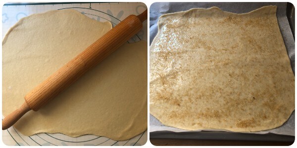 Rol elk deel uit met de deegroller tot een dunne plak, leg deze op een bakplaat bekleed met bakpapier, bestrijk de hele oppervlakte met wat zonnebloemolie en bestrooi het met bruine suiker.