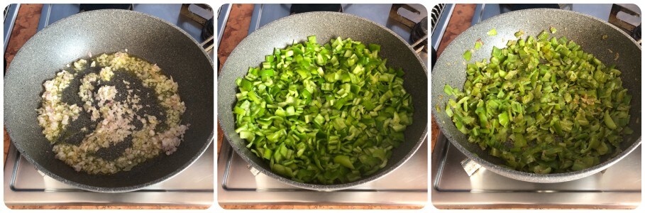 Verhit in een braadpan enkele eetlepels olie en fruit de gesnipperde sjalot. Laat het enkele ogenblikken sissen en voeg dan de friggitelli toe, zout ze en peper naar smaak en kook ze op een zacht vuur tot ze zacht zijn. Roer vaak.