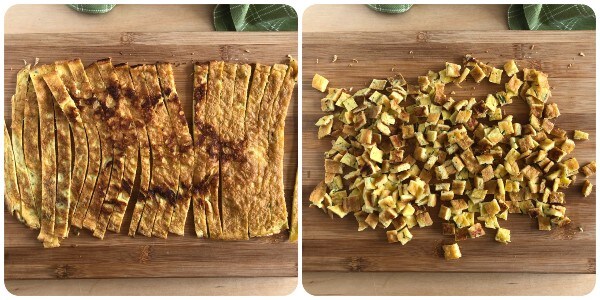Als het goudbruin is, haal het dan uit de bakplaat en laat het afkoelen; snijd het vervolgens eerst in reepjes en dan in blokjes.