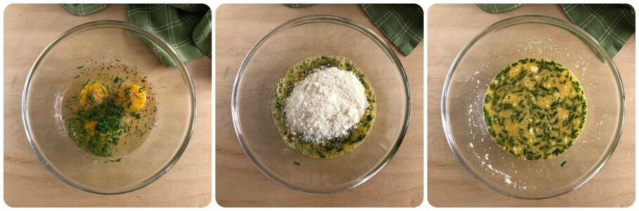 Breek de eieren in een mengkom, voeg een snufje zout, een draai zwarte peper en de bieslook toe, gewassen, gedroogd en met een schaar in stukjes geknipt. Klop alles met een kleine handklopper tot de dooiers en het eiwit gemengd zijn, voeg dan ook de geraspte kaas toe en meng goed.