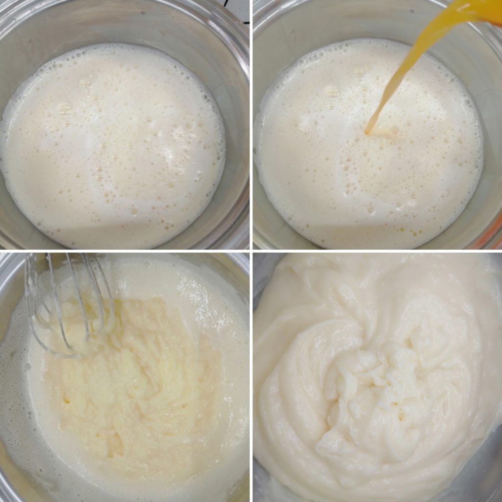 Voeg langzaam de warme melk toe, giet het hele mengsel in de pan, zet het op het fornuis en laat dikken op middelhoog vuur.