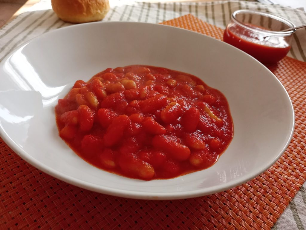 Een gerecht dat heel gemakkelijk te bereiden is. Bonen in tomatensaus zijn een zeer handig en smaakvol gerecht. Ik ben vaak gehaast, dus voor dit recept heb ik voorgekookte bonen gebruikt. In een halfuur heb je een compleet gerecht en zeer voedzaam. Bonen hebben veel eigenschappen, ze zijn van nature cholesterolvrij, rijk aan vezels en lecithine, een stof die helpt bij de emulsificatie van vetten. Ze bevatten ook vitamines, vooral van de groepen A, B, C en E, en mineralen zoals ijzer, kalium, calcium, fosfor en zink.