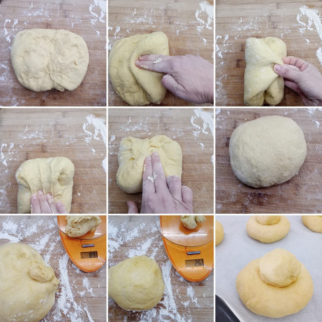 Na de rijstijd, giet het deeg op een met bloem bestoven werkblad en begin ballen te maken van elk 90 g voor de basis en ongeveer 20/25 g voor de tuppo.