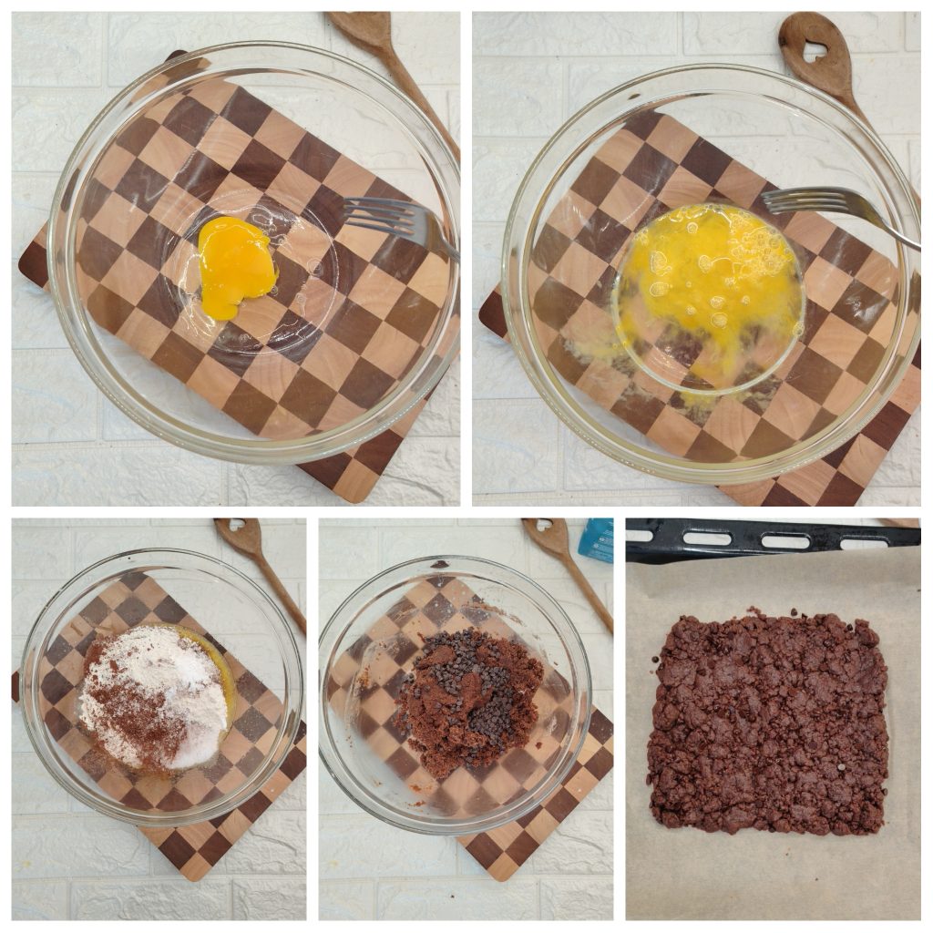 Klop in een kom het ei met een snufje zout en de olie. Voeg de bloem, de suiker, het bakpoeder en de cacao toe en meng goed tot je grove kruimels krijgt zonder een samenhangend deeg te vormen. Als het mengsel te droog is, voeg dan één of twee eetlepels water toe om te helpen bij het vormen van deze grove kruimels.