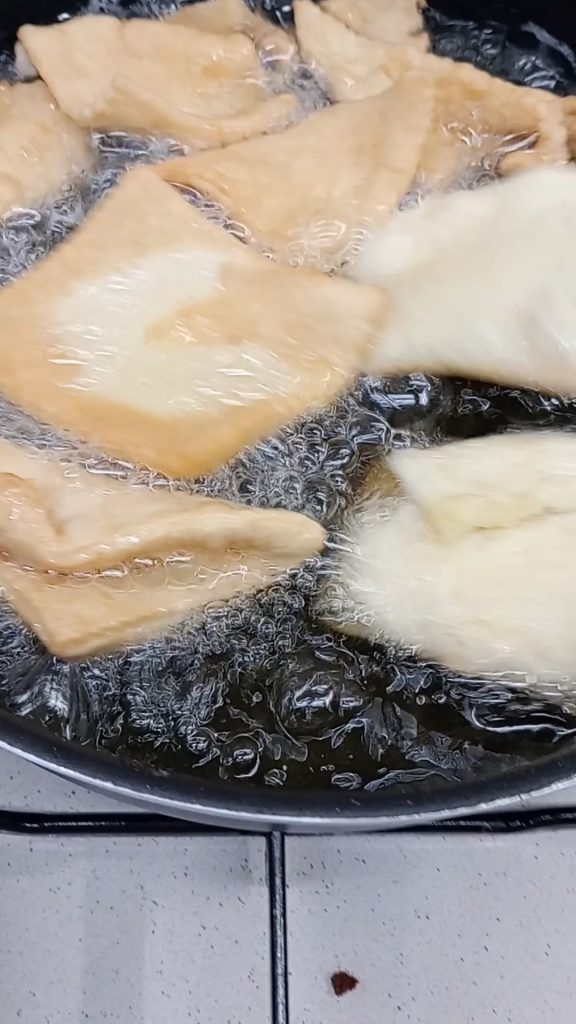➡️ De olie mag niet te heet zijn; als de chiacchiere te donker worden, verlaag dan de vlam of haal de pan van het vuur om de olie te laten afkoelen.