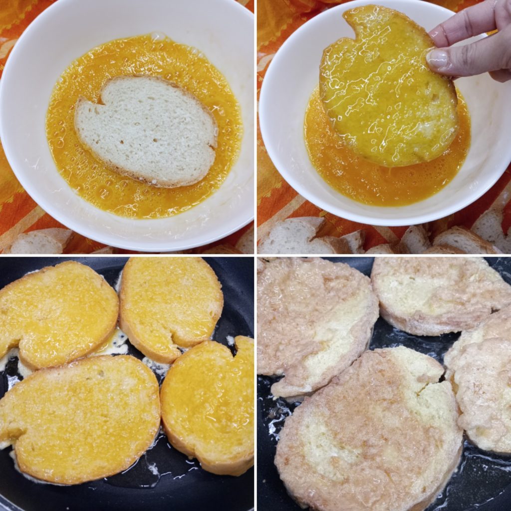 Verhit voldoende olie in een pan om te frituren. Als de olie heet is, bak het brood, een paar plakken tegelijk.
