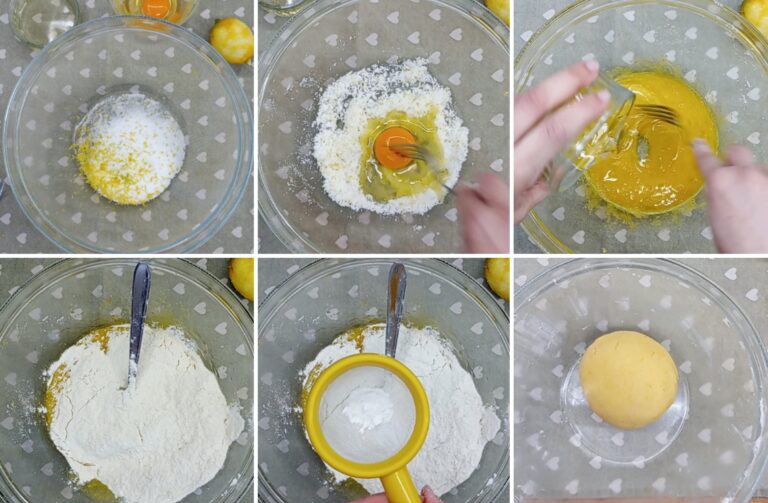 In een kom de suiker met de schil van de citroen bewerken (hoe meer je deze twee ingrediënten bewerkt, des te intenser zal het aroma zijn) voeg daarna het ei, de olie, de bloem en de theelepel bakpoeder toe.