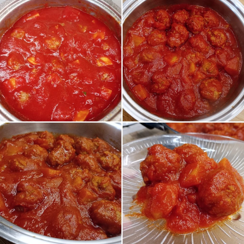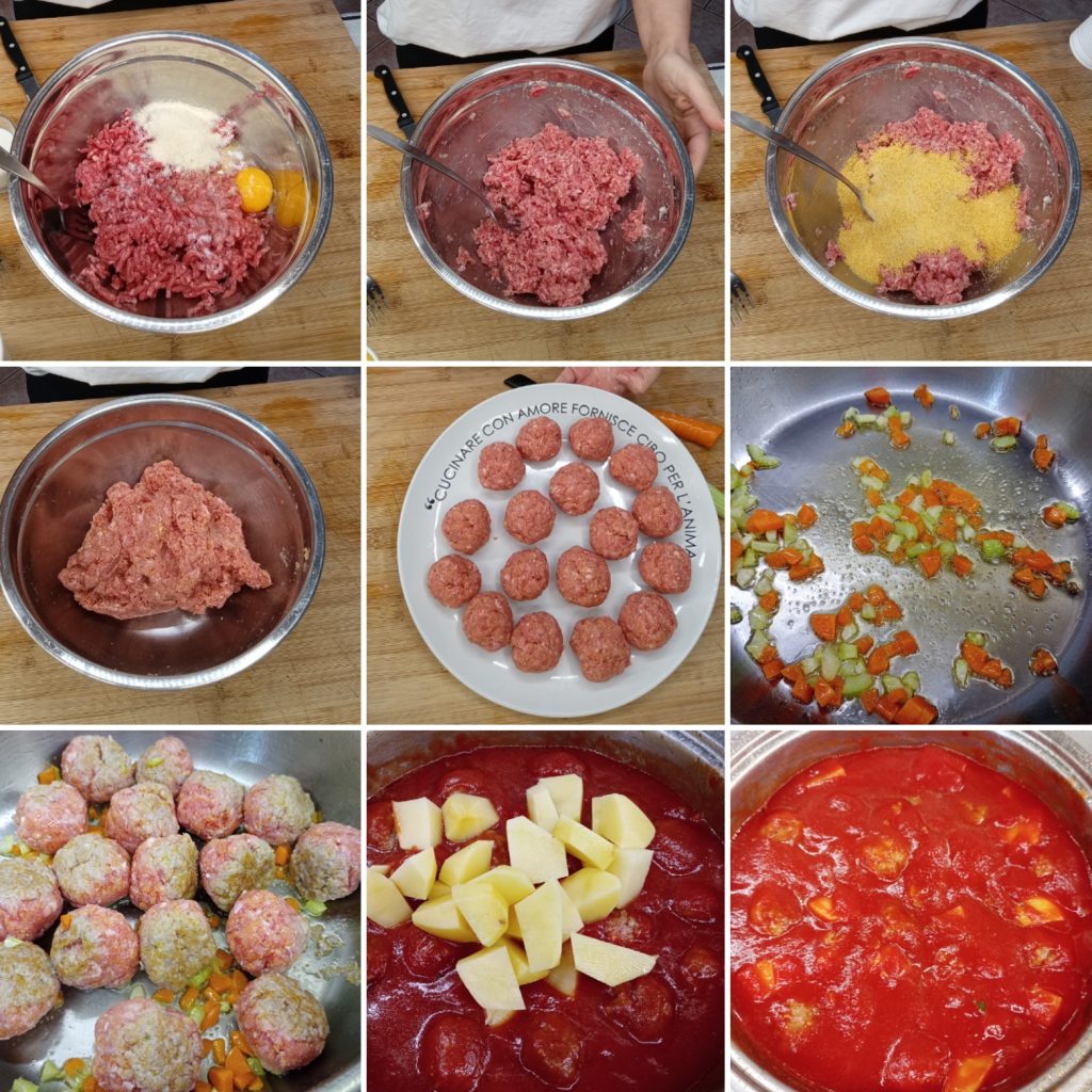 Braad de gehaktballen aan alle kanten aan, blus af met een halve glas water en voeg dan de tomatenpassata, het zout en ook de aardappelen toe, als je dat wilt (ik heb er drie grote toegevoegd).