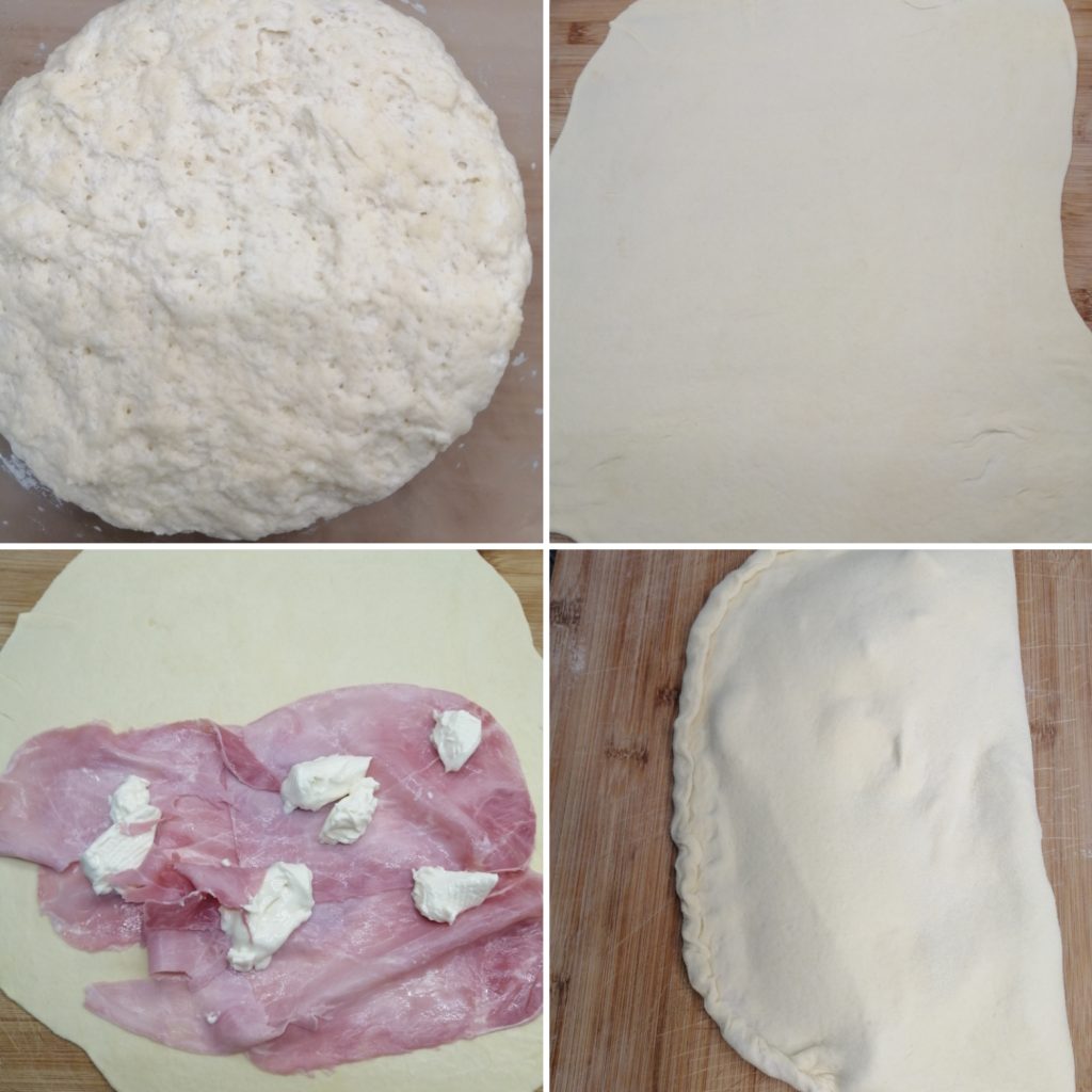 Op een bebloemd werkblad, rol elke portie heel dun uit met behulp van een deegroller. Het deeg is goed bewerkbaar, dus je zult geen moeite hebben om de gewenste dikte te bereiken.Leg de eerste deegschijf op een met bakpapier beklede bakplaat. Vul alleen de helft van het onderste oppervlak met de gekozen vulling (snijbiet en provola voor de eerste, ham en stracchino voor de tweede), laat een rand van ongeveer 2 cm vrij.