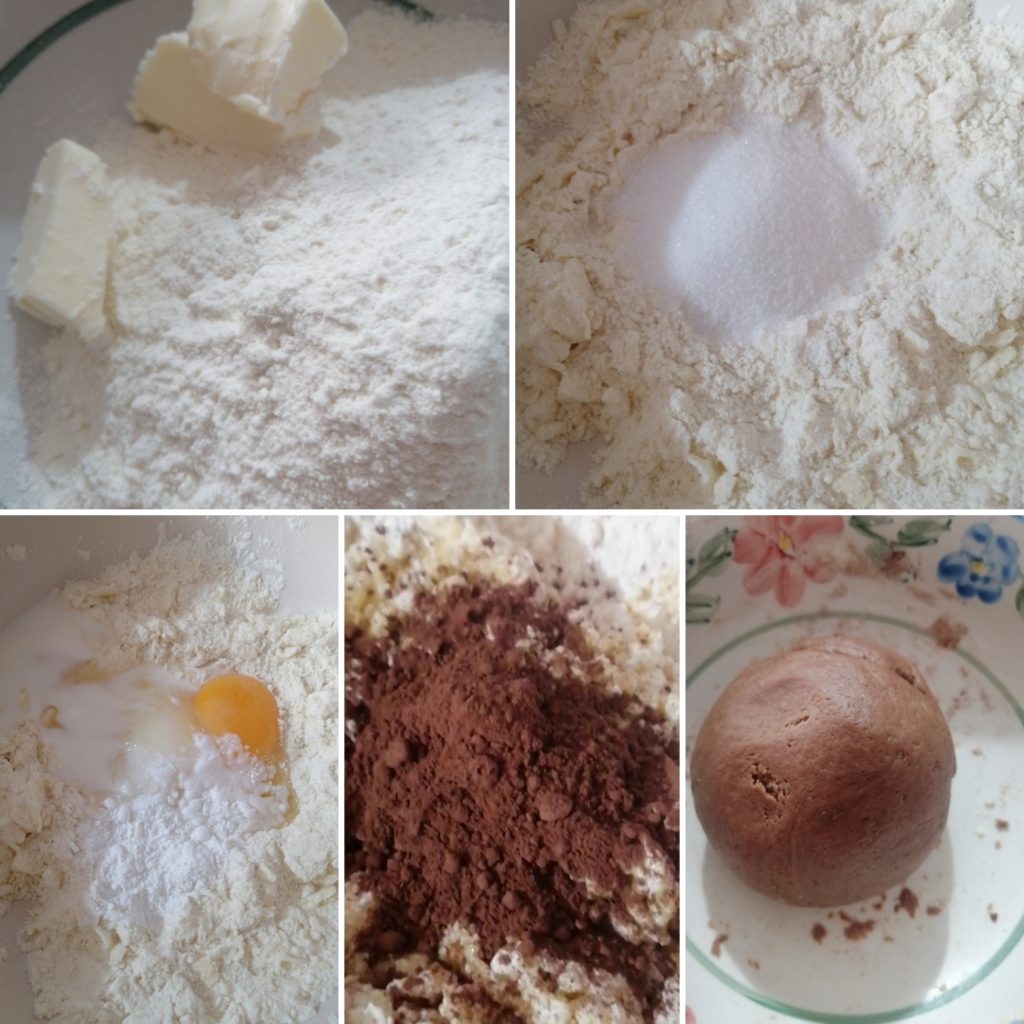 Voeg het ei, de melk, de suiker, de cacao, het zout en het bakpoeder toe en kneed alle ingrediënten