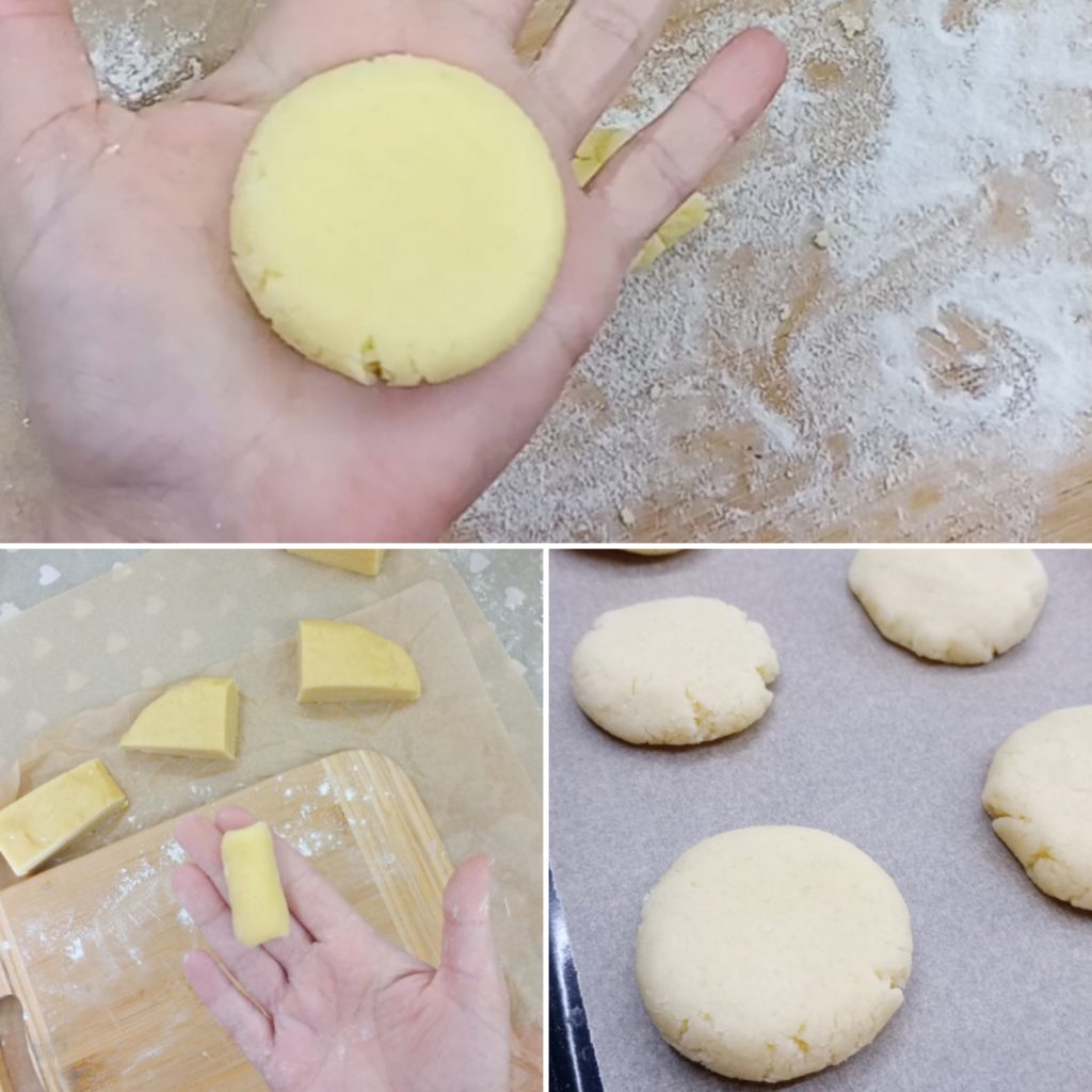Je kunt bolletjes vormen en deze daarna met de palm van je hand platdrukken voor ronde koekjes, of ze in de vorm van een cilinder maken voor een langwerpige versie.