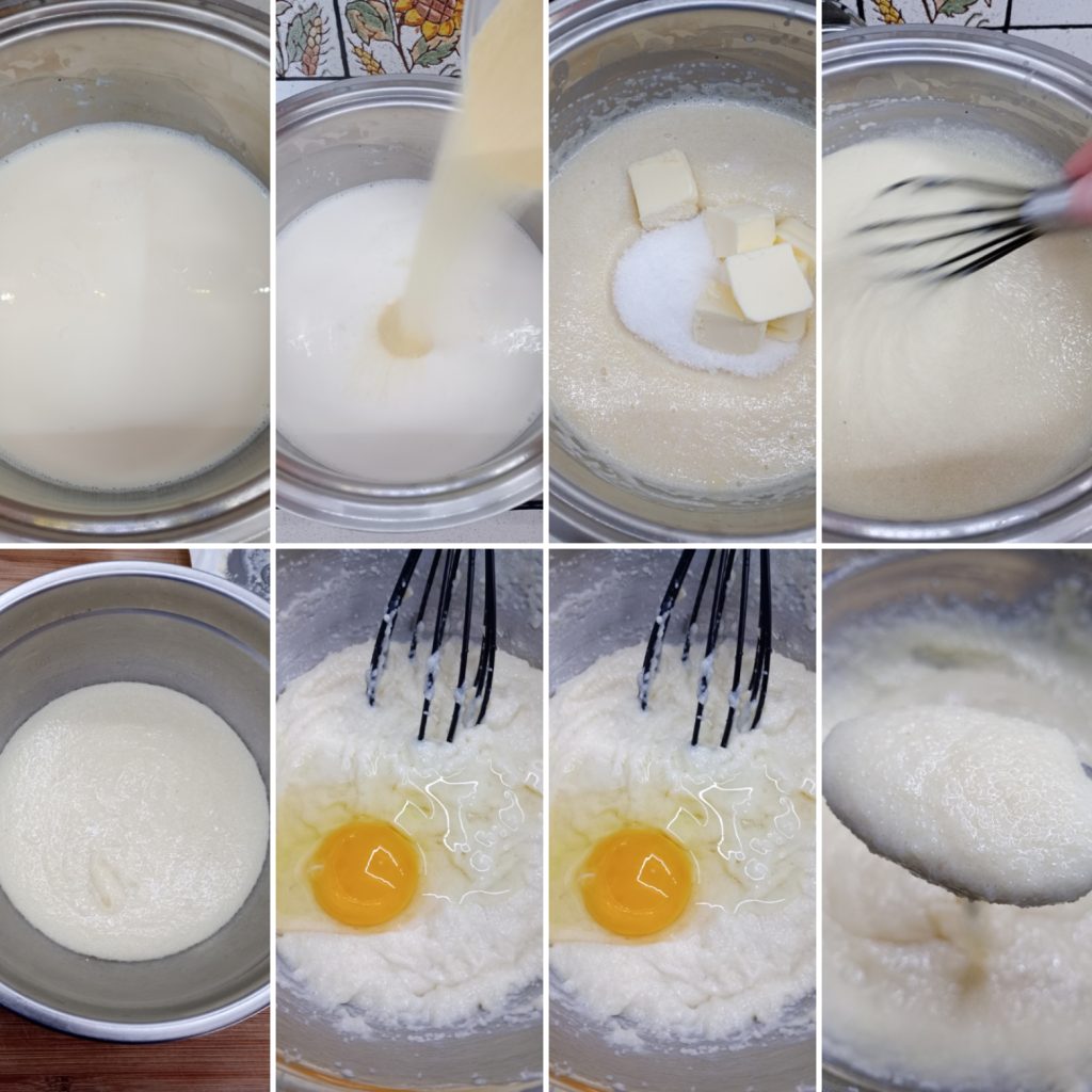 Giet de melk in een steelpan met hoge randen en breng bijna aan de kook, voeg de vanille toe. Wanneer de melk bijna kookt, begin het griesmeel toe te voegen en roer tot de consistentie romig is. Haal de pan van het fornuis en voeg de suiker en boter toe, roer totdat alle ingrediënten zijn gemengd. Giet het verkregen mengsel in een kom en laat afkoelen, voeg eenmaal afgekoeld de eieren één voor één toe.