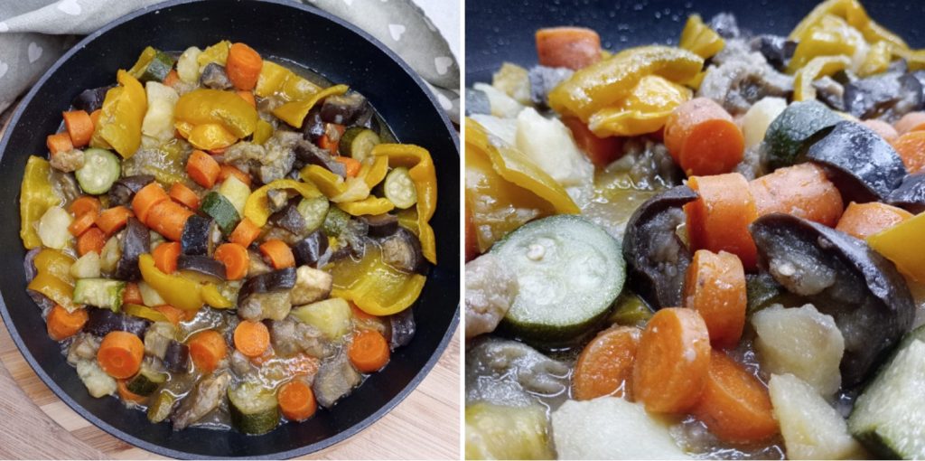 Snijd de groenten in kleine stukjes en doe ze in een pan met een beetje olie, voeg een half glas water toe en kook met een deksel gedurende 30 minuten (tot de groenten gemakkelijk met een vork kunnen worden doorboord).