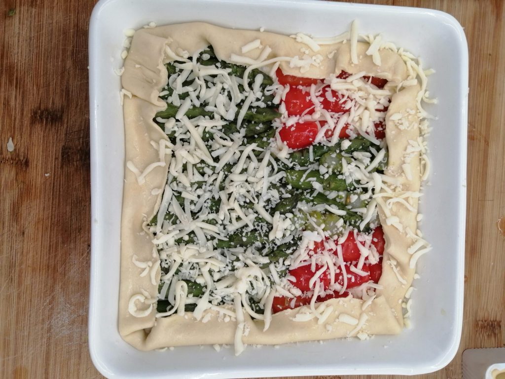 Leg de simpele deeg in de vorm, plaats de stracchino in stukjes op de bodem, de aspergepunten (vooraf geblancheerd en afgekoeld) en de tomaten in helften of plakjes. Vouw de randen goed om naar binnen om de vulling te bevatten.