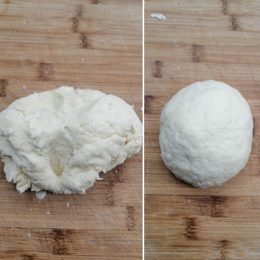Verplaats het deeg naar een werkvlak en kneed het een paar minuten tot het glad en homogeen is. Wikkel het in plasticfolie en leg het in de koelkast om te rusten.